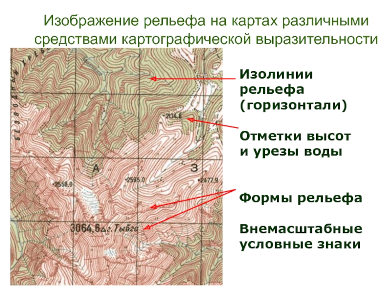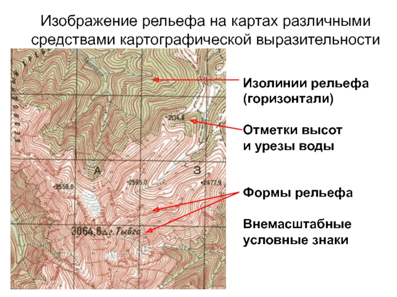 Слайд 38Изображение рельефа на картах различными средствами картографической выразительности