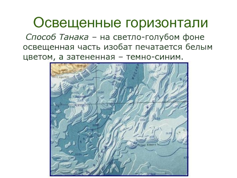 часть изобат печатается белым цветом, а затененная – темно-синим.