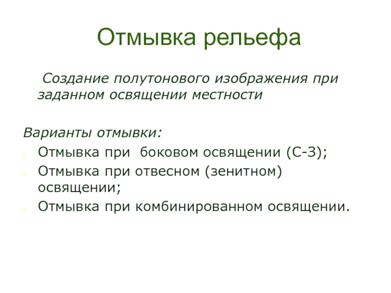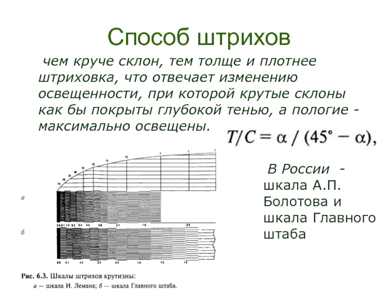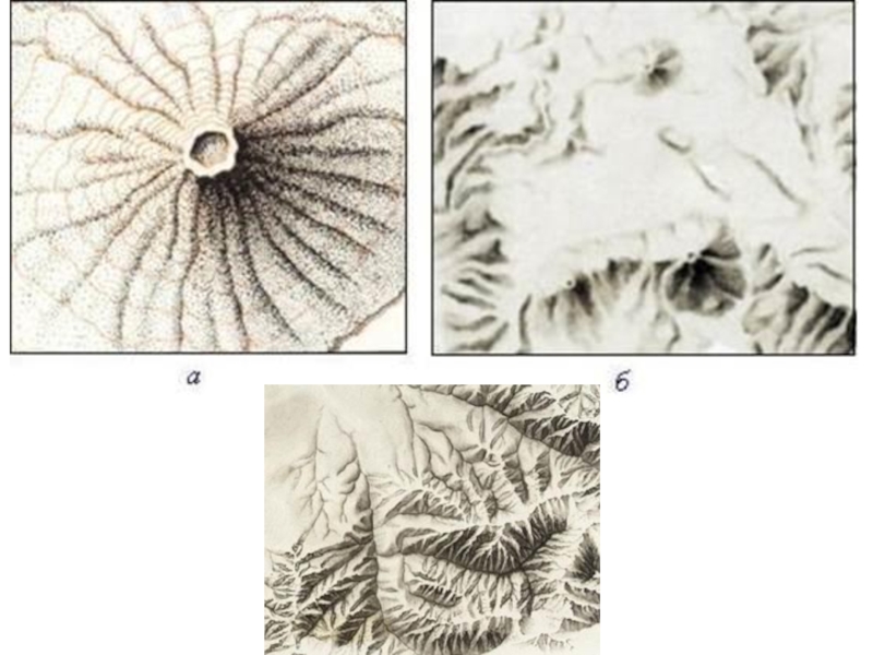 штриховка, что отвечает изменению освещенности, при которой крутые склоны как