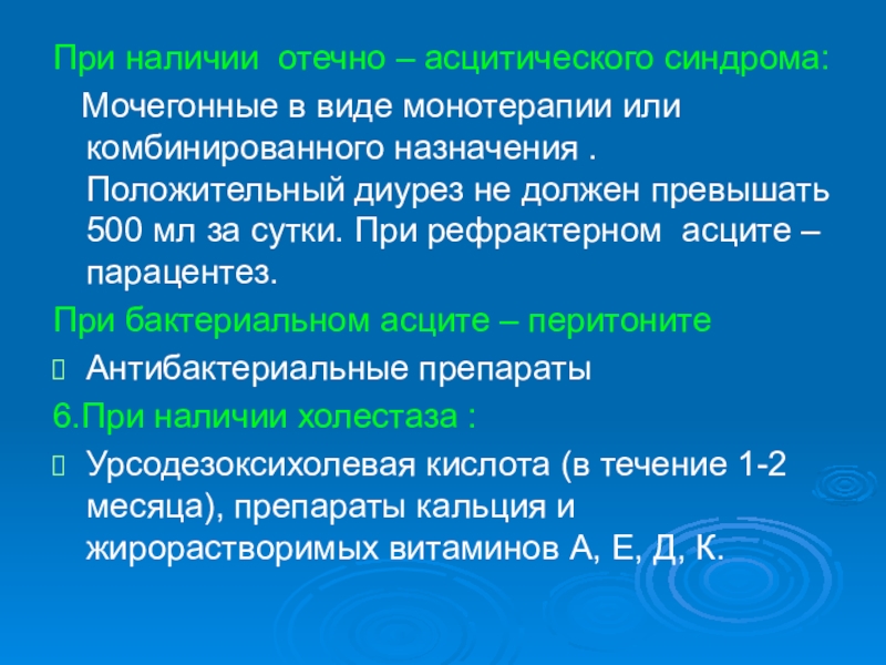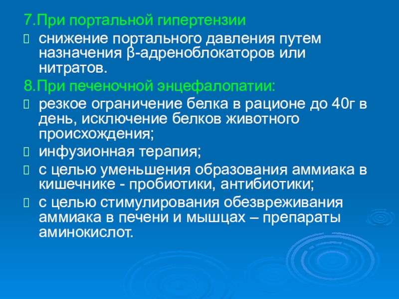 При развитии энцефалопатии ограничивают употребление белка, при асците - кухонной соли.