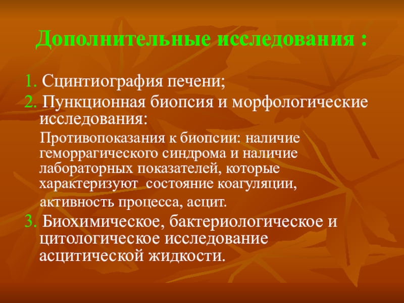 3. Биохимическое, бактериологическое и цитологическое исследование асцитической жидкости.
