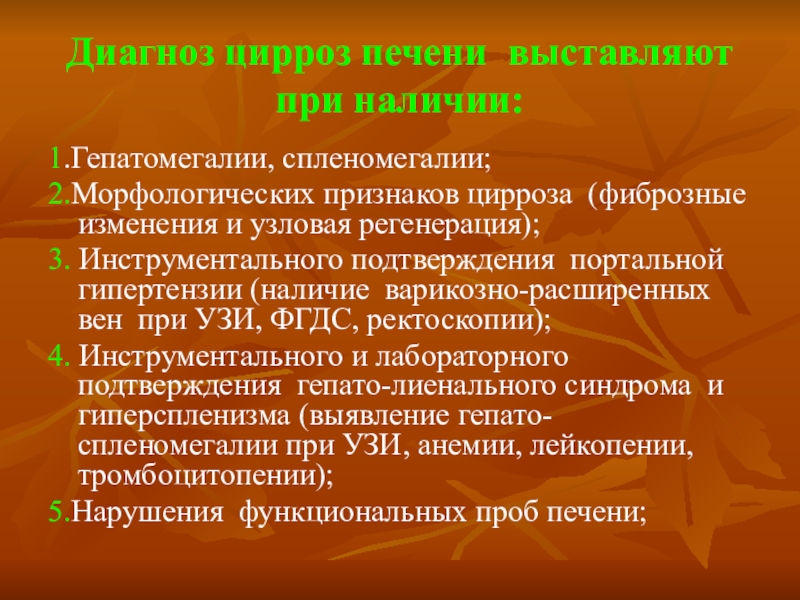 Слайд 6Диагноз цирроз печени выставляют при наличии: