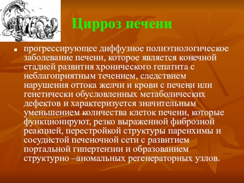 и крови с печени или генетически обусловленных метаболических дефектов и характеризуется значительным уменьшением количества клеток печени, которые функционируют, резко выраженной фиброзной реакцией, перестройкой структуры паренхимы и сосудистой печеночной сети с развитием портальной гипертензии и образованием структурно –аномальных регенераторных узлов.