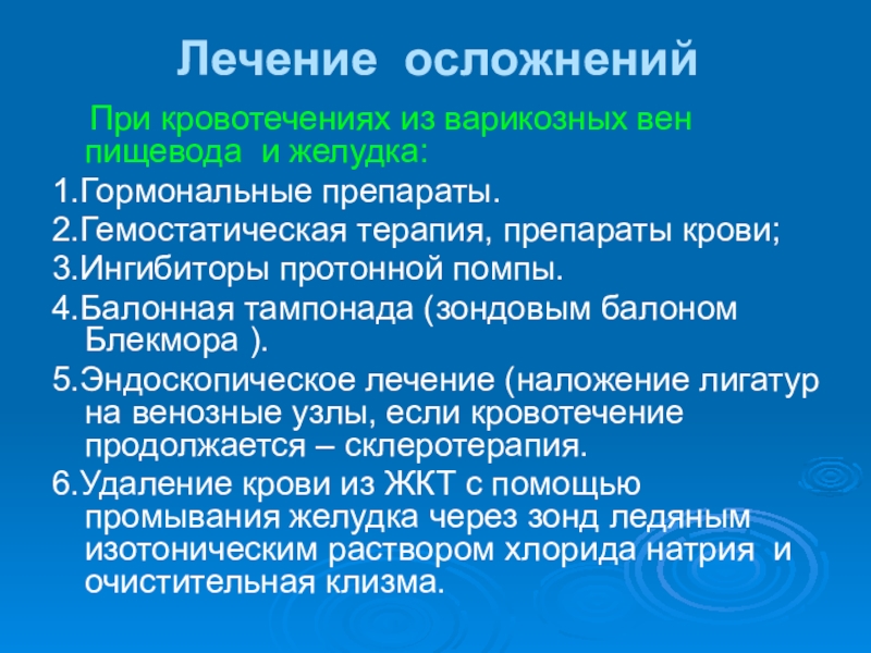 5.Эндоскопическое лечение (наложение лигатур на венозные узлы, если кровотечение продолжается – склеротерапия.