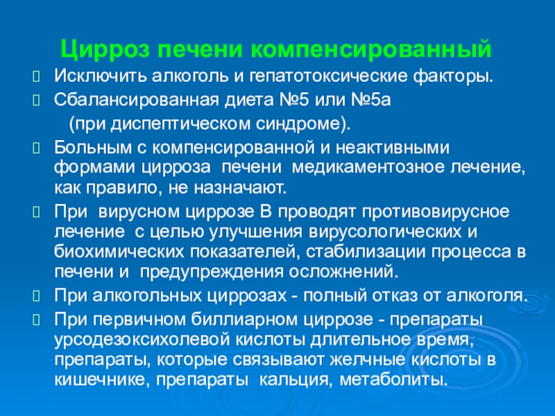 Больным с компенсированной и неактивными формами цирроза печени медикаментозное лечение, как правило, не назначают.