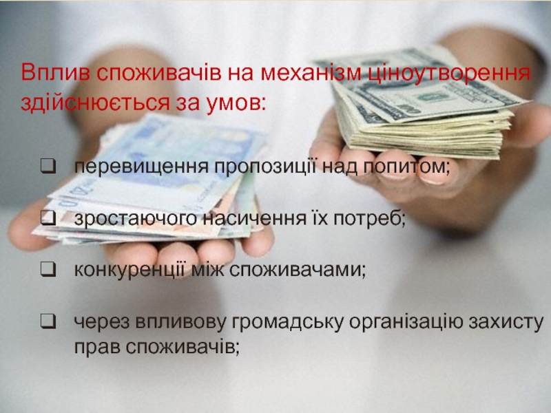 перевищення пропозиції над попитом;зростаючого насичення їх потреб;конкуренції між споживачами;через впливову громадську організацію захисту прав споживачів;Вплив споживачів на