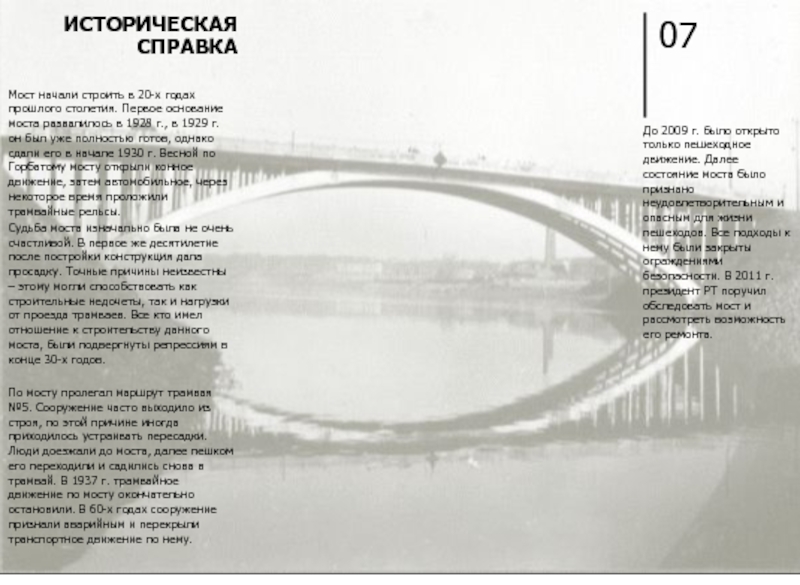 Судьба моста изначально была не очень счастливой. В первое же десятилетие после постройки конструкция дала просадку. Точные причины неизвестны – этому могли способствовать как строительные недочеты, так и нагрузки от проезда трамваев. Все кто имел отношение к строительству данного моста, были подвергнуты репрессиям в конце 30-х годов.