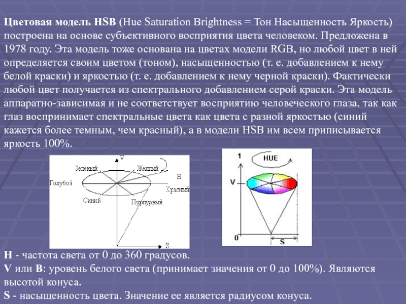 S - насыщенность цвета. Значение ее является радиусом конуса.