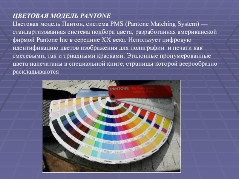 XX века. Использует цифровую идентификацию цветов изображения для полиграфии и печати как смесевыми, так и триадными красками. Эталонные пронумерованные цвета напечатаны в специальной книге, страницы которой веерообразно раскладываются