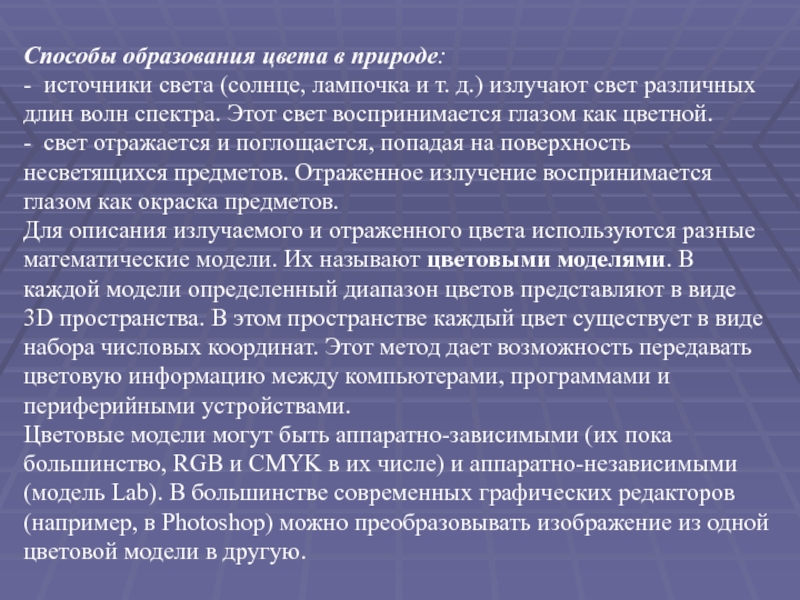Для описания излучаемого и отраженного цвета используются разные математические модели. Их называют цветовыми моделями. В каждой модели определенный диапазон цветов представляют в виде 3D пространства. В этом пространстве каждый цвет существует в виде набора числовых координат. Этот метод дает возможность передавать цветовую информацию между компьютерами, программами и периферийными устройствами.
