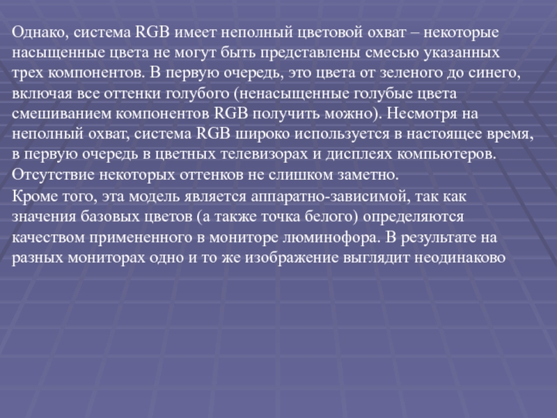 первую очередь, это цвета от зеленого до синего, включая все оттенки голубого (ненасыщенные голубые цвета смешиванием компонентов RGB получить можно). Несмотря на неполный охват, система RGB широко используется в настоящее время, в первую очередь в цветных телевизорах и дисплеях компьютеров. Отсутствие некоторых оттенков не слишком заметно.