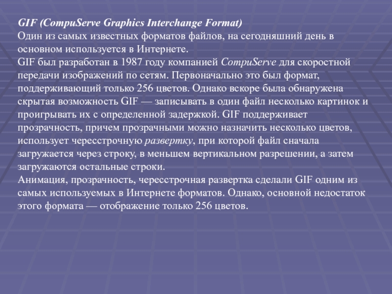 в 1987 году компанией CompuServe для скоростной передачи изображений по сетям. Первоначально это был формат, поддерживающий только 256 цветов. Однако вскоре была обнаружена скрытая возможность GIF — записывать в один файл несколько картинок и проигрывать их с определенной задержкой. GIF поддерживает прозрачность, причем прозрачными можно назначить несколько цветов,