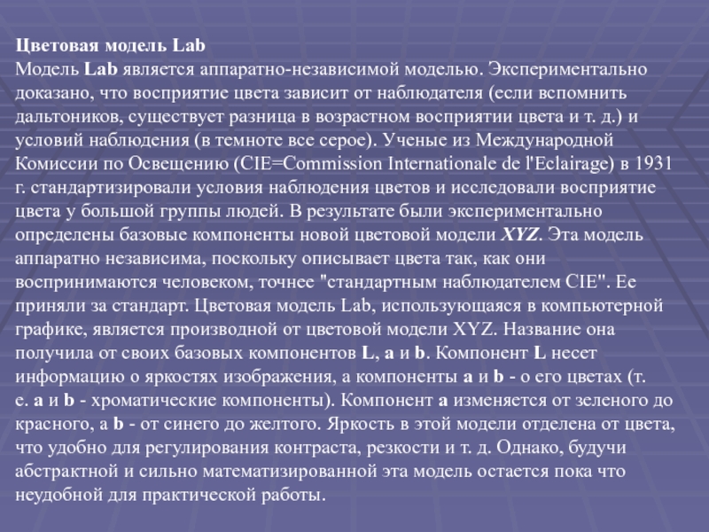 цвета и т. д.) и условий наблюдения (в темноте все серое). Ученые из Международной Комиссии по Освещению (CIE=Commission Internationale de l'Eclairage) в 1931 г. стандартизировали условия наблюдения цветов и исследовали восприятие цвета у большой группы людей. В результате были экспериментально определены базовые компоненты новой цветовой модели XYZ. Эта модель аппаратно независима, поскольку описывает цвета так, как они воспринимаются человеком, точнее "стандартным наблюдателем CIE". Ее приняли за стандарт. Цветовая модель Lab, использующаяся в компьютерной графике, является производной от цветовой модели XYZ. Название она получила от своих базовых компонентов L, a и b. Компонент L несет информацию о яркостях изображения, а компоненты а и b - о его цветах (т. е. a и b - хроматические компоненты). Компонент а изменяется от зеленого до красного, а b - от синего до желтого. Яркость в этой модели отделена от цвета, что удобно для регулирования контраста, резкости и т. д. Однако, будучи абстрактной и сильно математизированной эта модель остается пока что неудобной для практической работы.