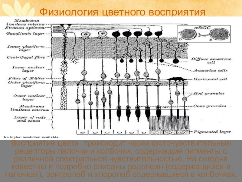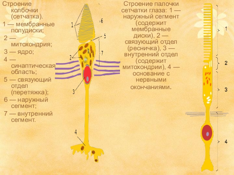 Строение палочки сетчатки глаза: 1 — наружный сегмент (содержит мембранные диски), 2 — связующий отдел (ресничка), 3 — внутренний отдел (содержит митохондрии), 4 — основание с нервными окончаниями.