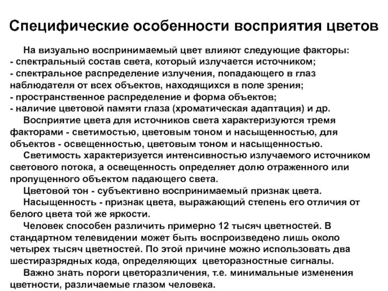 - светлотой, цветовым тоном и насыщенностью, отражающими уровень производимого световым потоком зрительного ощущения и определяющей цветовое восприятие.