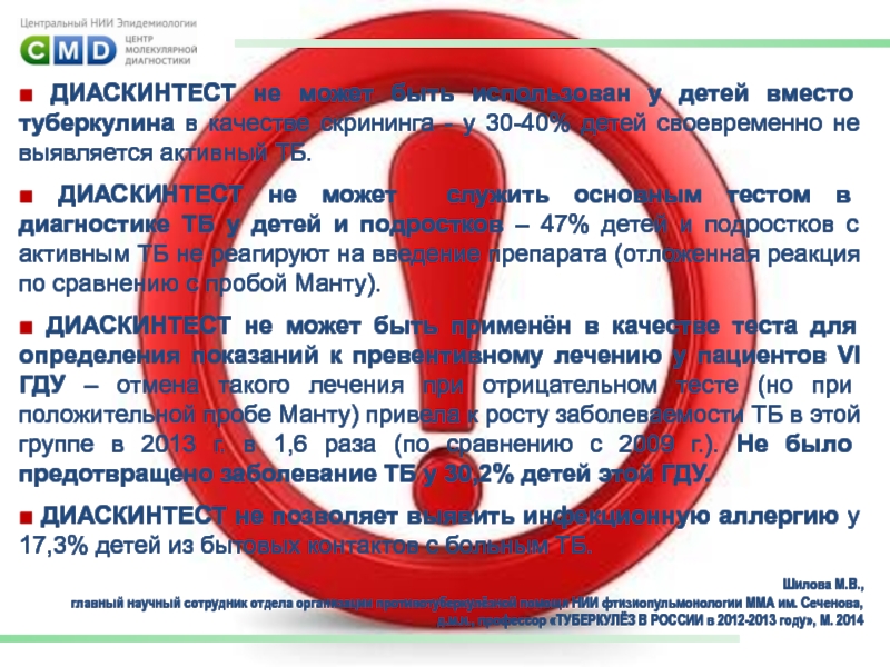 ■ ДИАСКИНТЕСТ не может быть применён в качестве теста для определения показаний к превентивному лечению у пациентов VI ГДУ – отмена такого лечения при отрицательном тесте (но при положительной пробе Манту) привела к росту заболеваемости ТБ в этой группе в 2013 г. в 1,6 раза (по сравнению с 2009 г.). Не было предотвращено заболевание ТБ у 30,2% детей этой ГДУ.