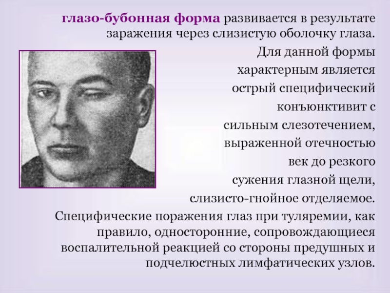 скарифицированные кожные покровы, но могут иметь место алиментарный и аспирационный механизмы заражения. Преобладает бубонная форма, реже встречается язвенно-бубонная, ангинозно-бубонная, глазо-бубонная.
