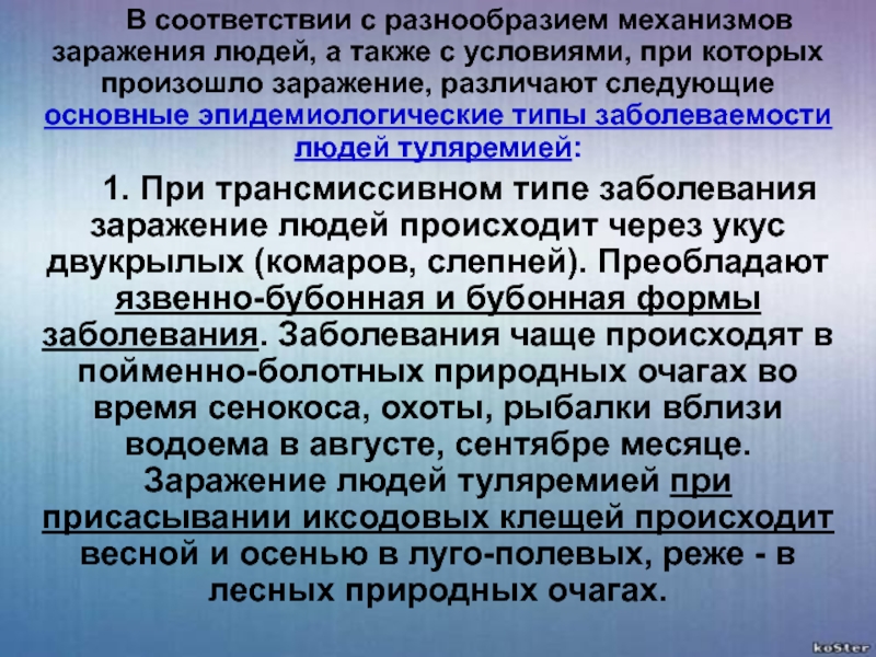 1. При трансмиссивном типе заболевания заражение людей происходит через укус двукрылых (комаров, слепней). Преобладают язвенно-бубонная и бубонная формы заболевания. Заболевания чаще происходят в пойменно-болотных природных очагах во время сенокоса, охоты, рыбалки вблизи водоема в августе, сентябре месяце. Заражение людей туляремией при присасывании иксодовых клещей происходит весной и осенью в луго-полевых, реже - в лесных природных очагах.