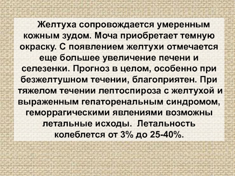 в целом, особенно при безжелтушном течении, благоприятен. При тяжелом течении лептоспироза с желтухой и выраженным гепаторенальным синдромом, геморрагическими явлениями возможны летальные исходы. Летальность колеблется от 3% до 25-40%.