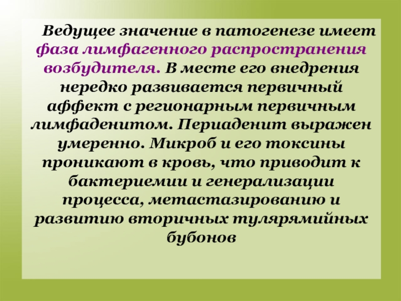 Слайд 19Ведущее значение в патогенезе имеет фаза лимфагенного распространения возбудителя. В