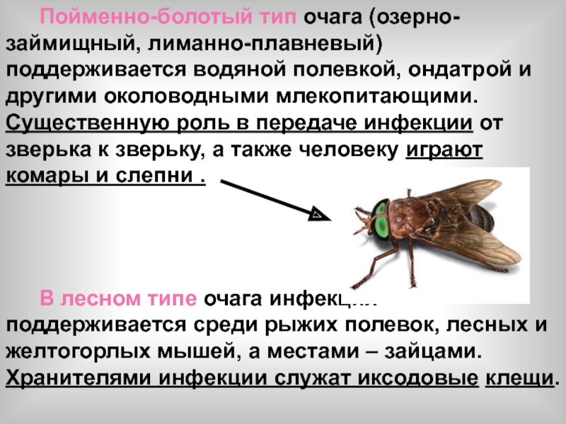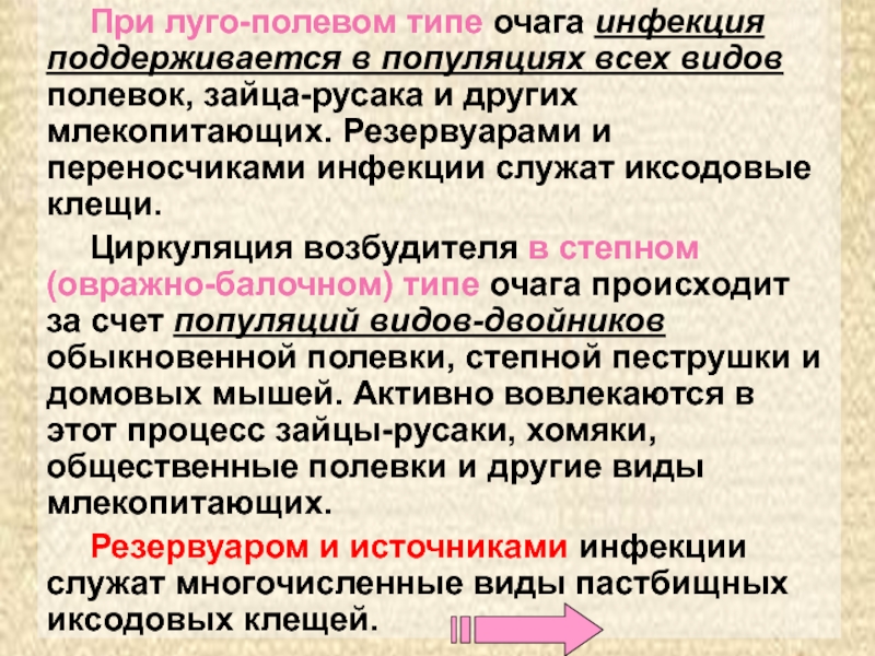 Слайд 9При луго-полевом типе очага инфекция поддерживается в популяциях всех видов