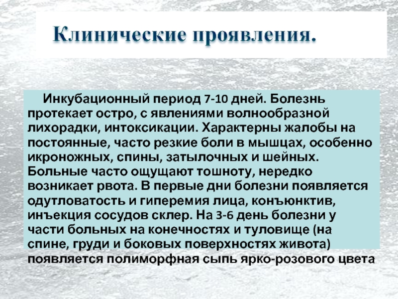 мышцах, особенно икроножных, спины, затылочных и шейных. Больные часто ощущают тошноту, нередко возникает рвота. В первые дни болезни появляется одутловатость и гиперемия лица, конъюнктив, инъекция сосудов склер. На 3-6 день болезни у части больных на конечностях и туловище (на спине, груди и боковых поверхностях живота) появляется полиморфная сыпь ярко-розового цвета