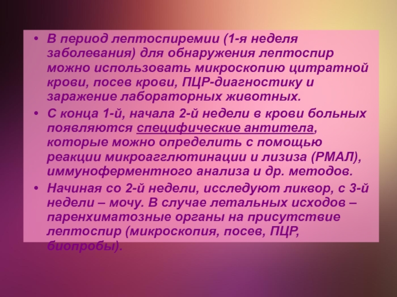 Слайд 54В период лептоспиремии (1-я неделя заболевания) для обнаружения лептоспир можно