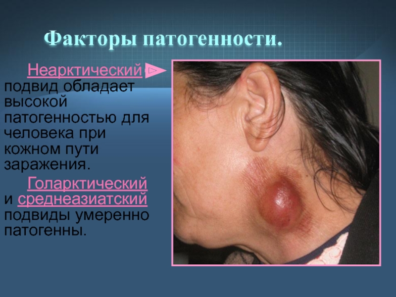 Слайд 5Неарктический подвид обладает высокой патогенностью для человека при кожном пути