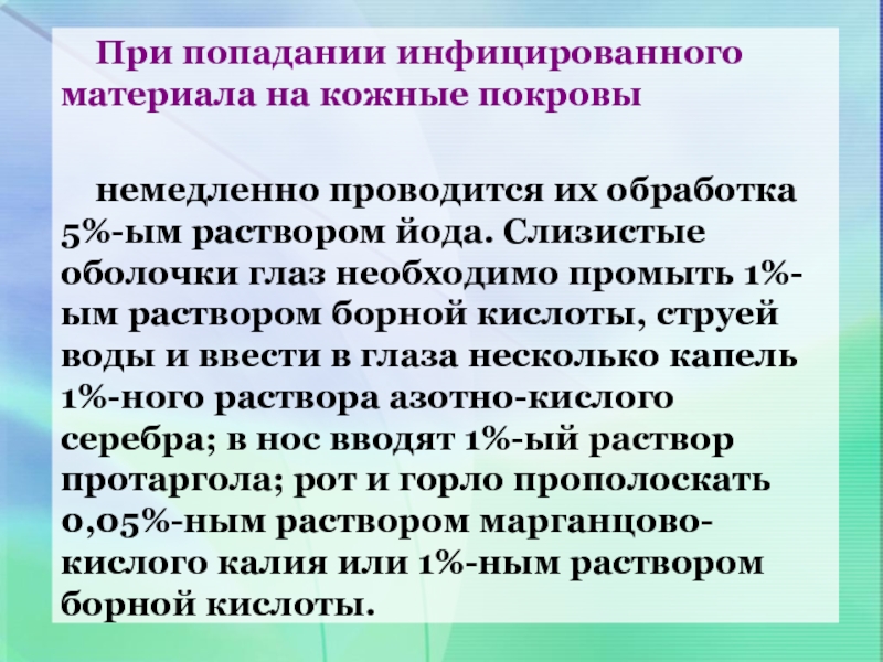 Слайд 57При попадании инфицированного материала на кожные покровы