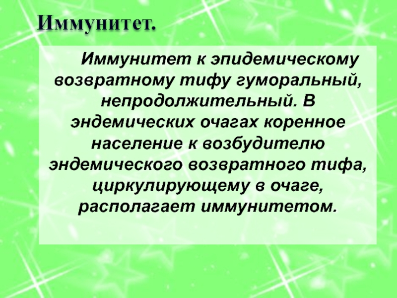 Слайд 68Иммунитет к эпидемическому возвратному тифу гуморальный, непродолжительный. В эндемических очагах