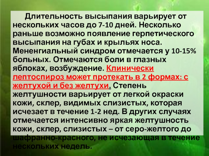 Мененгиальный синдром отмечается у 10-15% больных. Отмечаются боли в глазных яблоках, возбуждение. Клинически лептоспироз может протекать в 2 формах: с желтухой и без желтухи. Степень желтушности варьирует от легкой окраски кожи, склер, видимых слизистых, которая исчезает в течение 1-2 нед. В других случаях отмечается интенсивно яркая желтушность кожи, склер, слизистых – от серо-желтого до шафранно-красного, не исчезающая в течение нескольких недель.