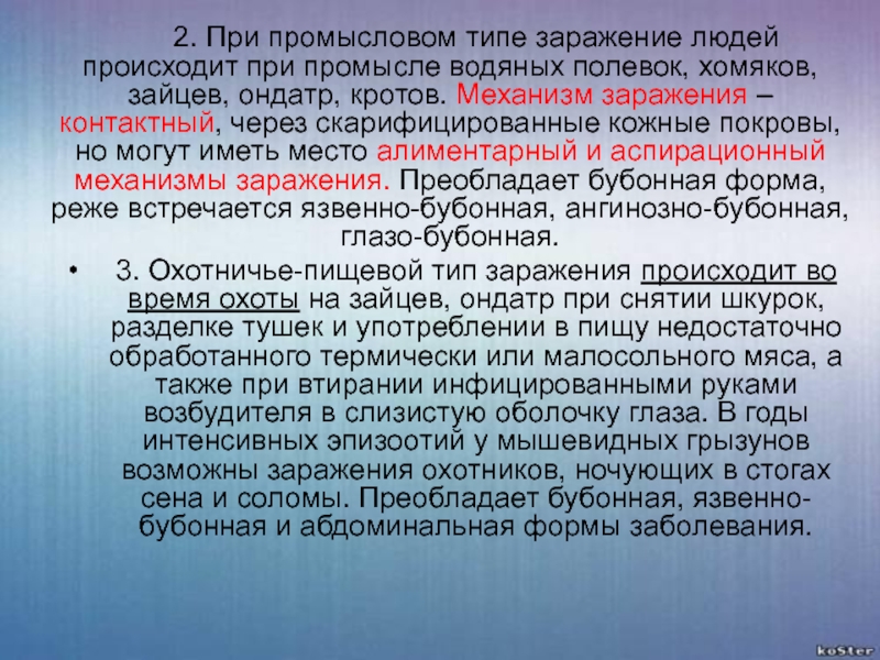 3. Охотничье-пищевой тип заражения происходит во время охоты на зайцев, ондатр при снятии шкурок, разделке тушек и употреблении в пищу недостаточно обработанного термически или малосольного мяса, а также при втирании инфицированными руками возбудителя в слизистую оболочку глаза. В годы интенсивных эпизоотий у мышевидных грызунов возможны заражения охотников, ночующих в стогах сена и соломы. Преобладает бубонная, язвенно-бубонная и абдоминальная формы заболевания.