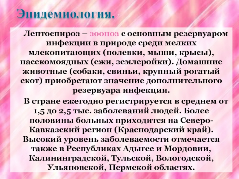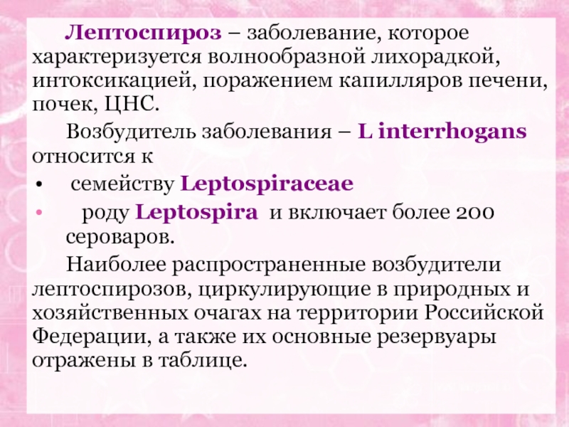 Слайд 46Лептоспироз – зооноз с основным резервуаром инфекции в природе среди