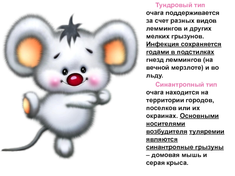 Синантропный тип очага находится на территории городов, поселков или их окраинах. Основными носителями возбудителя туляремии являются синантропные грызуны – домовая мышь и серая крыса.