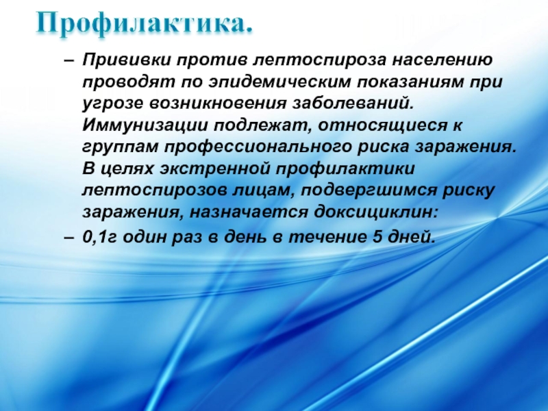 В целях экстренной профилактики лептоспирозов лицам, подвергшимся риску заражения, назначается доксициклин: