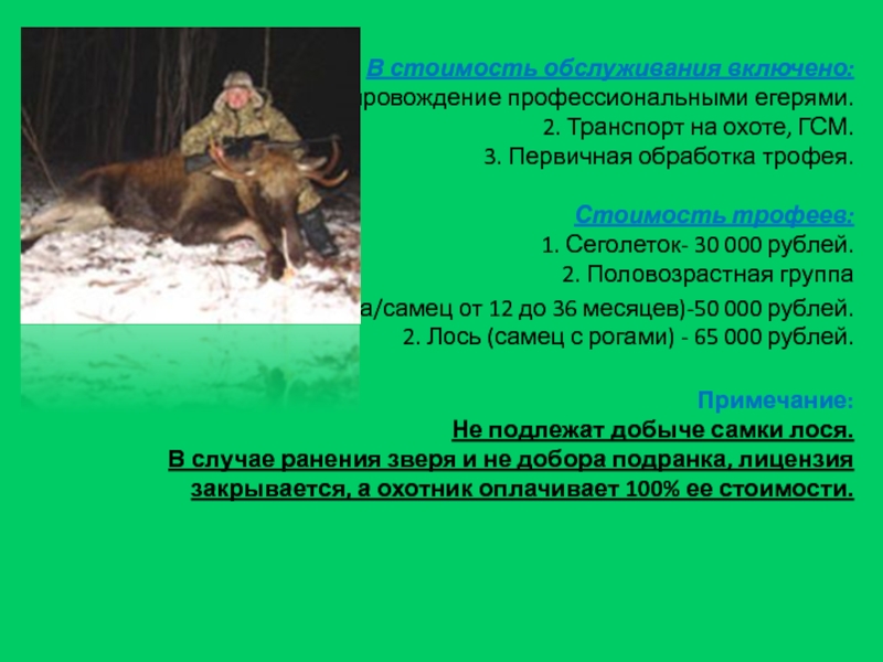 В случае ранения зверя и не добора подранка, лицензия закрывается, а охотник оплачивает 100% ее стоимости.
