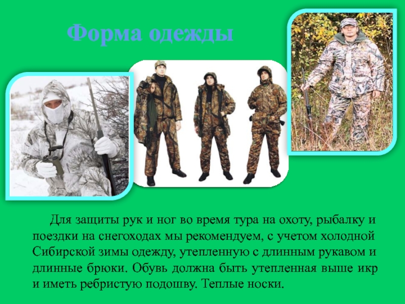 охоту, рыбалку и поездки на снегоходах мы рекомендуем, с учетом холодной Сибирской зимы одежду, утепленную с длинным рукавом и длинные брюки. Обувь должна быть утепленная выше икр и иметь ребристую подошву. Теплые носки.