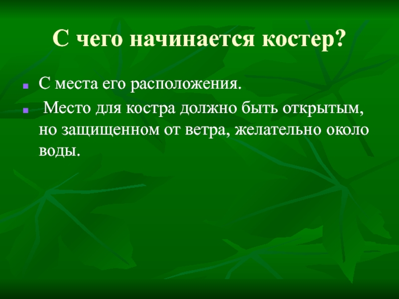 костра должно быть открытым, но защищенном от ветра, желательно около