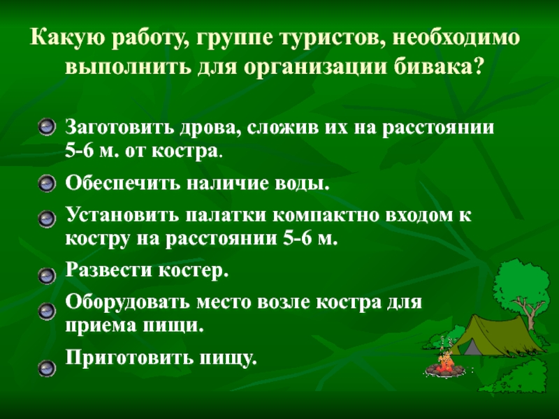 Какую работу, группе туристов, необходимо выполнить для организации бивака?
