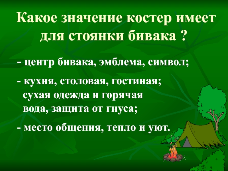 Какое значение костер имеет для стоянки бивака ?