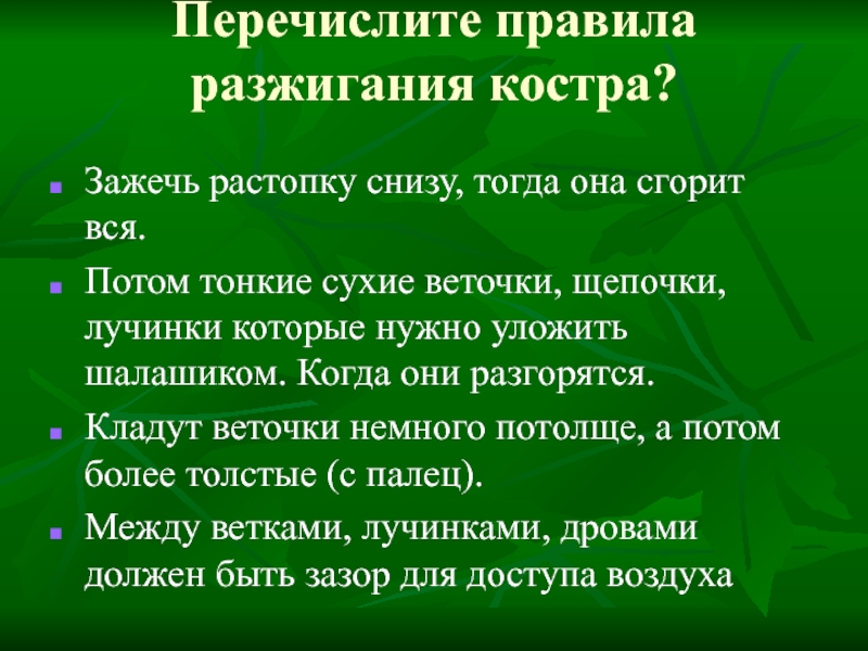 Слайд 17Перечислите правила разжигания костра?