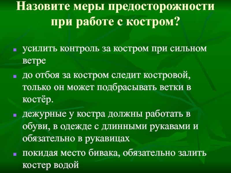 Слайд 16Назовите меры предосторожности при работе с костром?