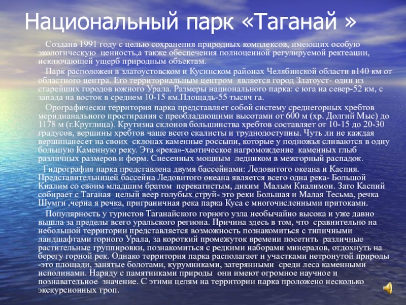 Национальный парк «Таганай »     Созданв 1991 году с целью сохранения природных комплексов, имеющих