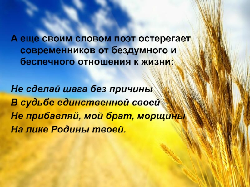 Слайд 7А еще своим словом поэт остерегает современников от бездумного и