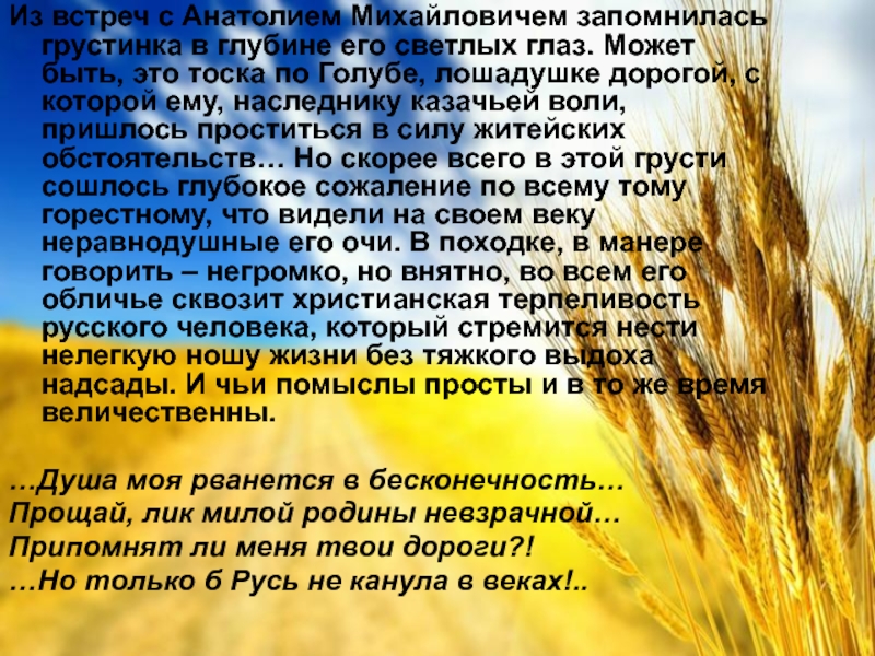 Слайд 8Из встреч с Анатолием Михайловичем запомнилась грустинка в глубине его