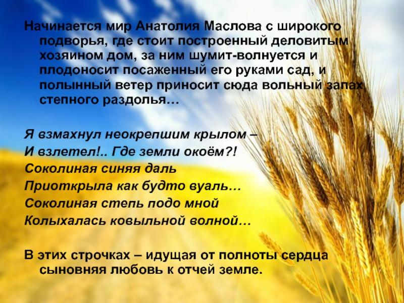 Слайд 6Начинается мир Анатолия Маслова с широкого подворья, где стоит построенный
