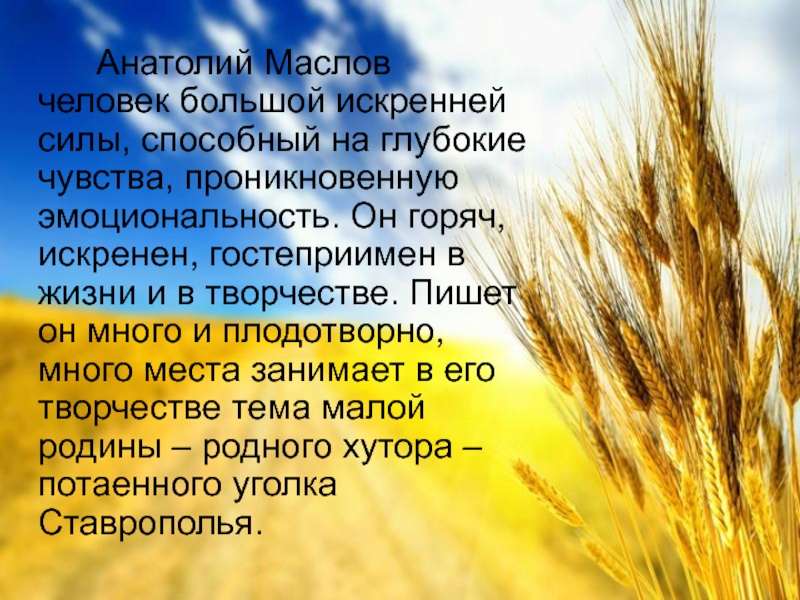 гостеприимен в жизни и в творчестве. Пишет он много и плодотворно, много места занимает в его творчестве тема малой родины – родного хутора – потаенного уголка Ставрополья.