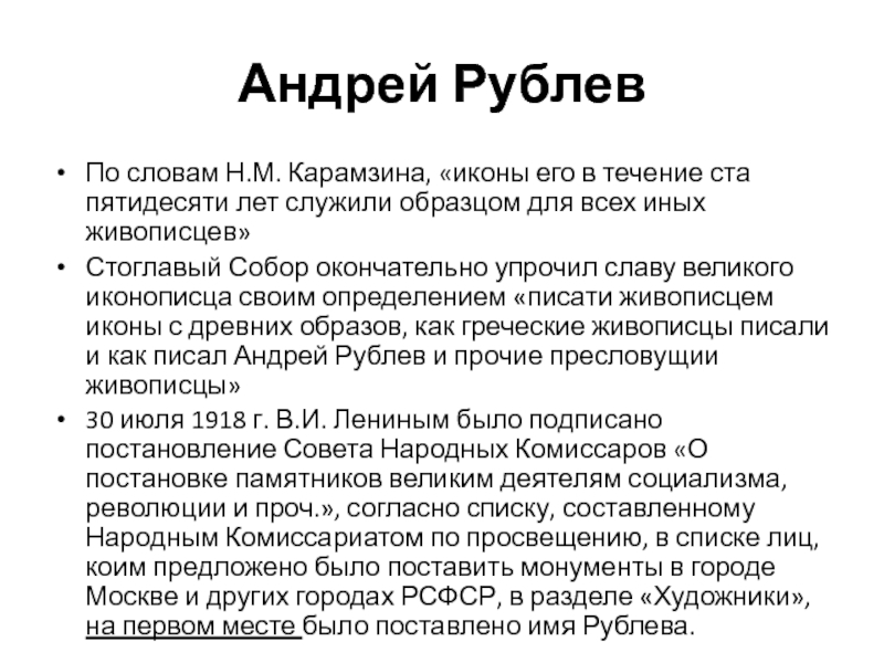 упрочил славу великого иконописца своим определением «писати живописцем иконы с древних образов, как греческие живописцы писали и как писал Андрей Рублев и прочие пресловущии живописцы»30 июля 1918 г. В.И. Лениным было подписано постановление Совета Народных Комиссаров «О постановке памятников великим деятелям социализма, революции и проч.», согласно списку, составленному Народным Комиссариатом по просвещению, в списке лиц, коим предложено было поставить монументы в городе Москве и других городах РСФСР, в разделе «Художники», на первом месте было поставлено имя Рублева.