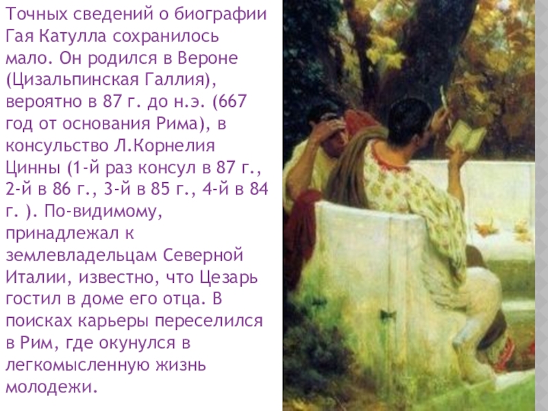 Слайд 3Точных сведений о биографии Гая Катулла сохранилось мало. Он родился