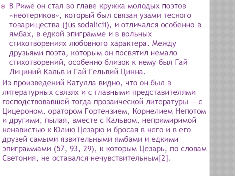 Из произведений Катулла видно, что он был в литературных связях и с главными представителями господствовавшей тогда прозаической литературы — с Цицероном, оратором Гортензием, Корнелием Непотом и другими, пылая, вместе с Кальвом, непримиримой ненавистью к Юлию Цезарю и бросая в него и в его друзей самыми язвительными ямбами и едкими эпиграммами (57, 93, 29), к которым Цезарь, по словам Светония, не оставался нечувствительным[2].